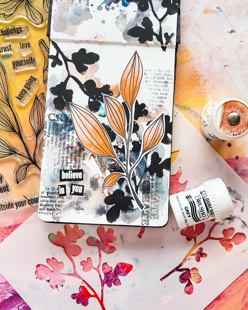 Hi there, Susanne here sharing a quick and easy art journal page using Brushos, our Sketchy Leaves 7 stencil and stamps from Collage Leaves 3 and Mix It Up 5. This set is almost sold our and won’t be restocked! So get your now!