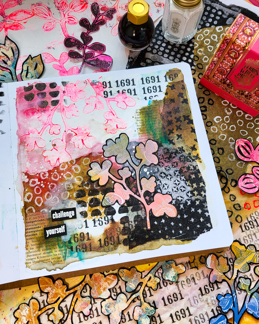 Hi there, Susanne here sharing a mixed media art journaling tutorial using Collage Fodder, Inks and a focal image made with our Sketchy Leaves 7 stencil and words from Collage Leaves 3.