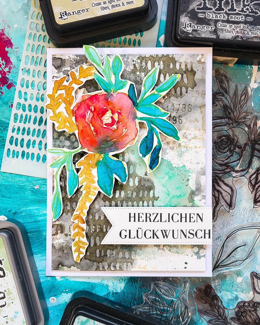 Hi there, Susanne here sharing a greeting card with the Distress Ink backgrounds I shared yesterday, a stamp from our Sketchy Flowers 1 set and a greeting from Kartengrüße.